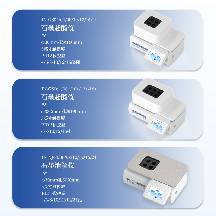 本石墨消解仪是替代传统电热板、电热炉的理想选择,同时仪器采用经典的30 mm孔径设计,完美兼容市场主流的50 mL、100 mL消解管,是实验室值得信赖的得力助手。