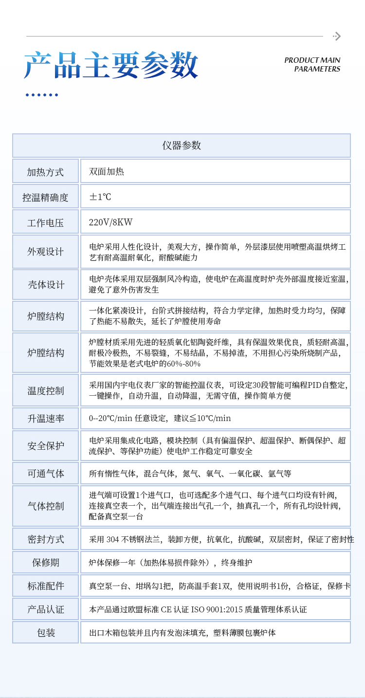 保修期 | 炉体保修一年(加热体易损件除外),终身维护 |