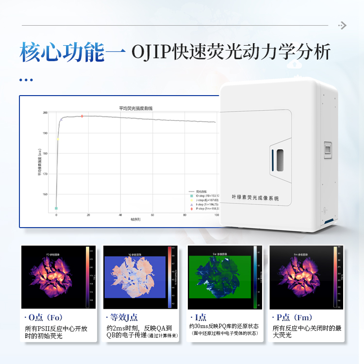 简要描述: 叶绿素荧光成像仪是一款专业的植物光合作用研究仪器,采用高灵敏度CMOS相机和LED光源控制,实现对植物叶片叶绿素荧光的快速、无损检测与成像分析。系统集成了OJIP快速荧光动力学测量和PAM调制荧光测量两大核心功能,能够全面评估植物光合系统的活性、光能利用效率以及环境胁迫响应。