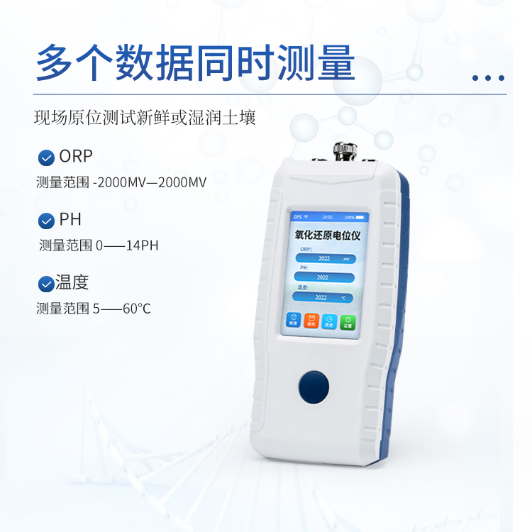 土壤氧化还原电位仪(ORP计)主要用于现场原位测试新鲜或湿润土壤的氧化还原电位,水(介质)氧化还原电位、PH、温度等数据的测量。符合《HJ746-2015土壤氧化还原电位的测定电位法》标准。