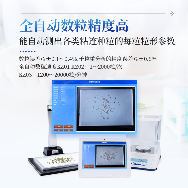 智能考种系统可以测量各种表面光滑的籽粒的数量、千/百粒重与平均粒型(包括长、宽、长宽比、周长、面积),利用图像ORC 识别技术、图像定位、空间转换等技术实现快速识别种子数量及作物性状指标。