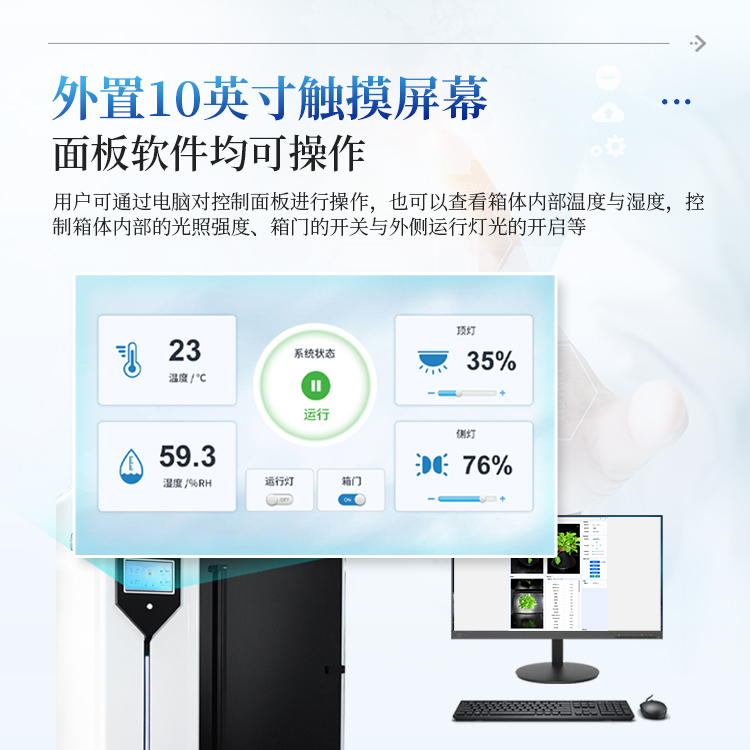 3、仪器控制:外置10寸触摸屏,可以查看箱体内部温度与湿度、控制箱体内部的光照强度、箱门的开关与外侧运行灯光的开启等;也可通过电脑软件控制操作