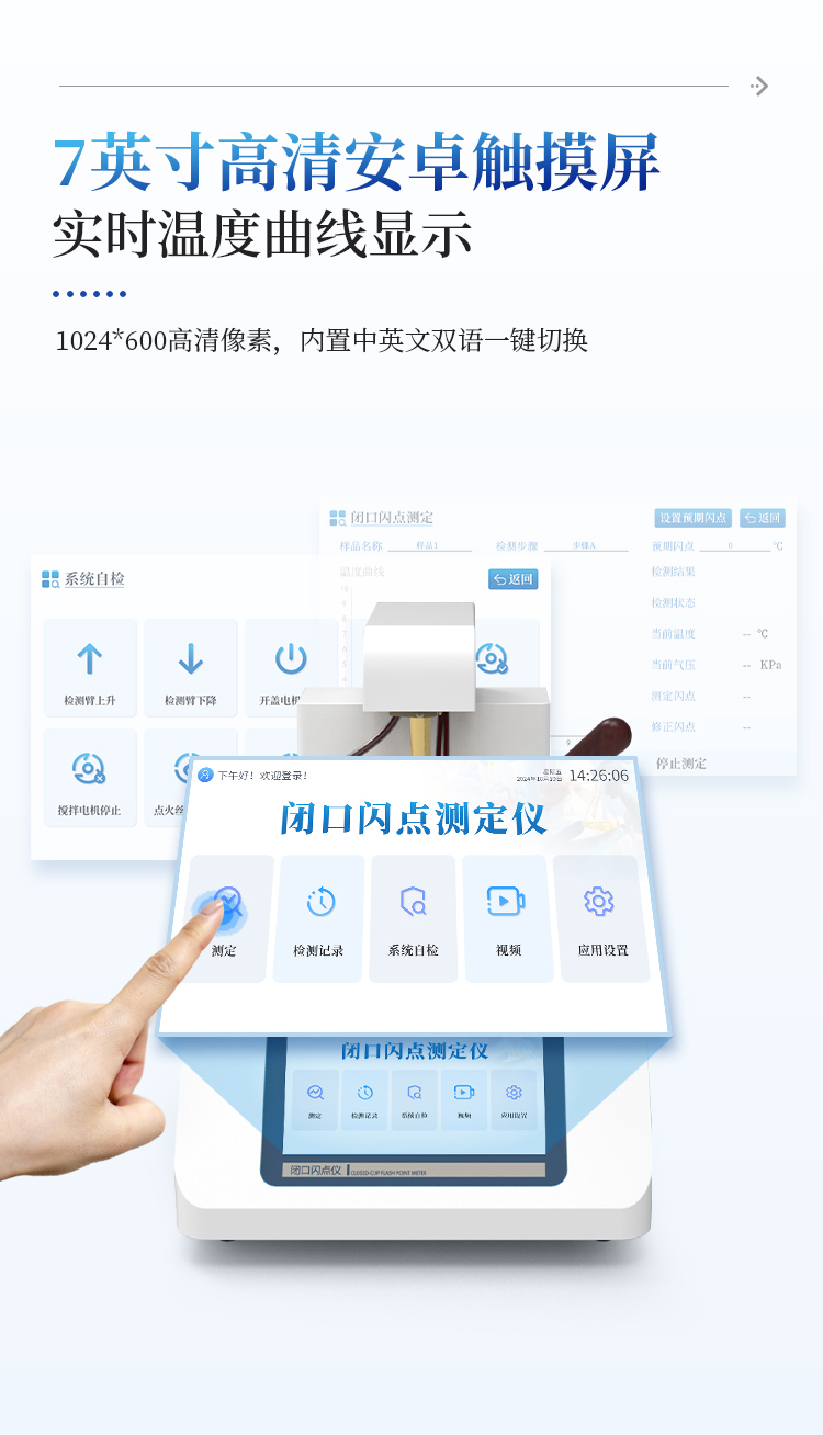 简要描述: 开口闪点测试仪是用来测定石油产品的开口闪点值、燃点值。仪器采用电点火方式,无需任何可燃性气体,完全符合ASTMD92(GB3536-2008)、GB267-88的方法要求。采用ARM系列高性能微处理器,电擦除存储器,彩色液晶显示器及触摸屏,PID自整定等多项最新技术。