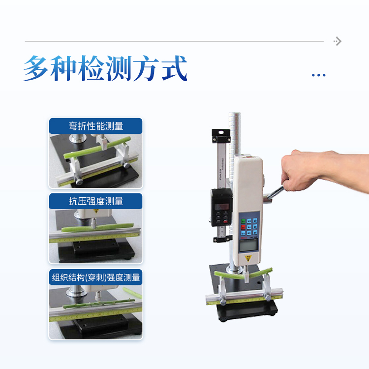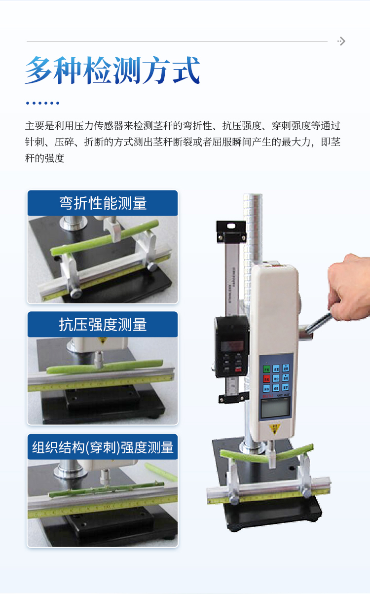 1、三种不同测头:可进行茎杆弯折性能测量、茎秆抗压强度测量、茎杆组织结构(穿刺)强度测量;弯折支架距离可调,并标有刻度。