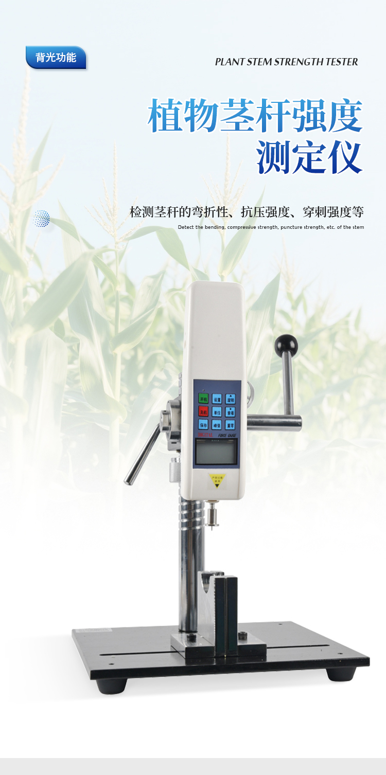 植物茎秆的强度是决定作物抗倒伏能力的一个主要因素,长期以来玉米,高梁、烟草等的倒伏给作物的机械收割造成很大的困难。从机械化水平来说,造成大量的粮食浪费。另外,作物倒伏导致光照不充分,使其生产量受到极大的限制。在作物生长的各个阶段对其茎秆进行活体测量,进而根据茎杆纤维层的抗弯阻力与抗倒伏能力的相关性对群体测量数据进行统计处理,对作物的栽培和育种具有重要意义。植物茎秆强度仪采用拉压力传感器,通过针刺、压碎、折断的方式测出茎秆断裂或者屈服瞬间产生的最大力,即茎秆的强度。