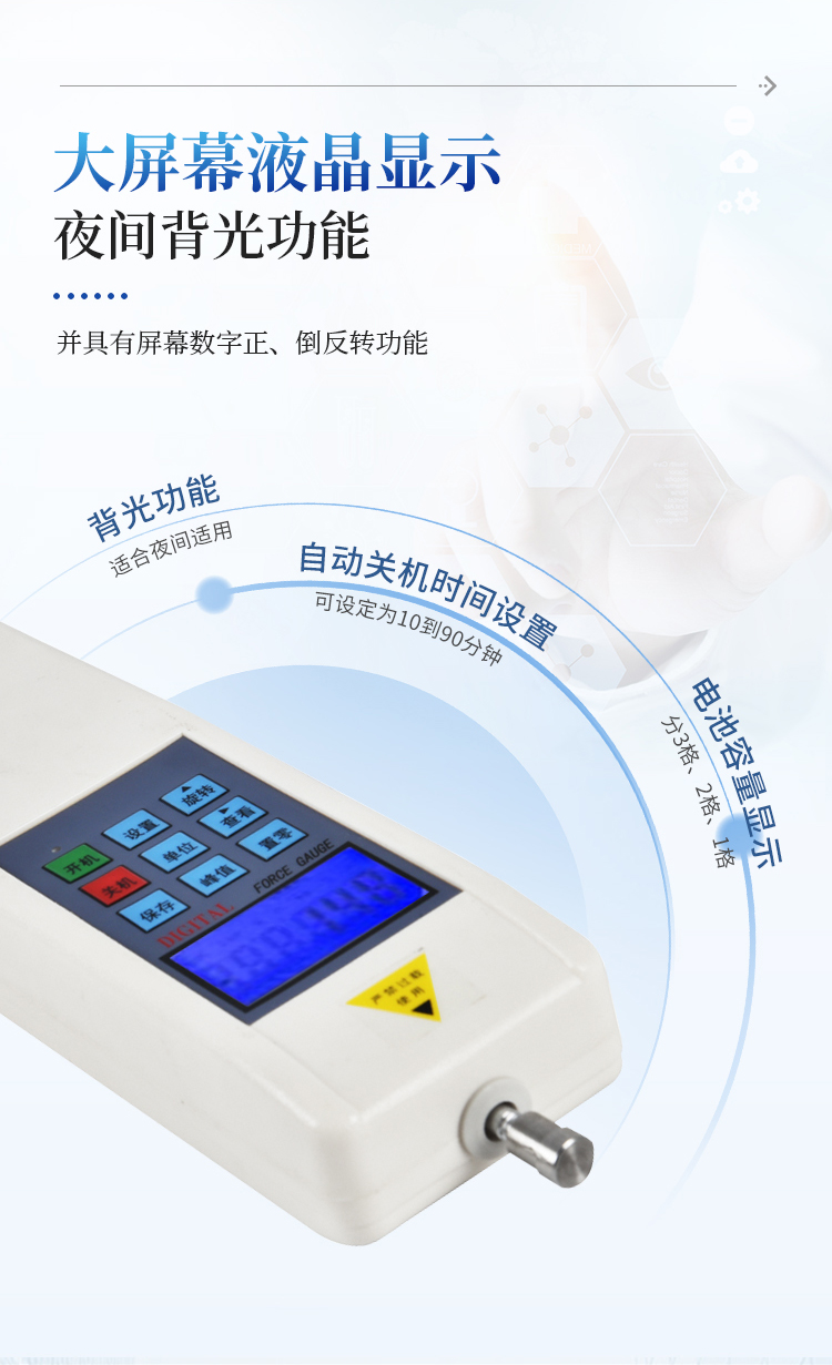 最大负荷:500N (其他量程可定制,N、Kg和ib三种单位可自动转换)
