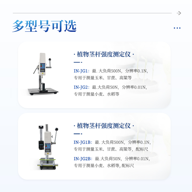 植物茎秆的强度是决定作物抗倒伏能力的一个主要因素,长期以来玉米,高梁、烟草等的倒伏给作物的机械收割造成很大的困难。从机械化水平来说,造成大量的粮食浪费。另外,作物倒伏导致光照不充分,使其生产量受到极大的限制。在作物生长的各个阶段对其茎秆进行活体测量,进而根据茎杆纤维层的抗弯阻力与抗倒伏能力的相关性对群体测量数据进行统计处理,对作物的栽培和育种具有重要意义。植物茎秆强度仪采用拉压力传感器,通过针刺、压碎、折断的方式测出茎秆断裂或者屈服瞬间产生的最大力,即茎秆的强度