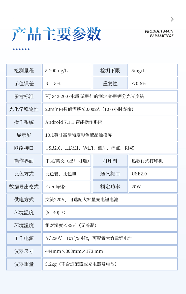 简要描述: 硫酸盐测定仪是参考标准《水质 硫酸盐的测定 铬酸钡分光光度法》研发设计制造,适用于国内外众多检测标准。 本仪器主要检测水中硫酸盐含量指标,兼具智能数据分析功能,图表、列表显示数据,分析一目了然;高清晰度彩色液晶触摸显示屏,Android智能操作系统,中文显示界面,中英文键盘,人性化操作,使用更简单。