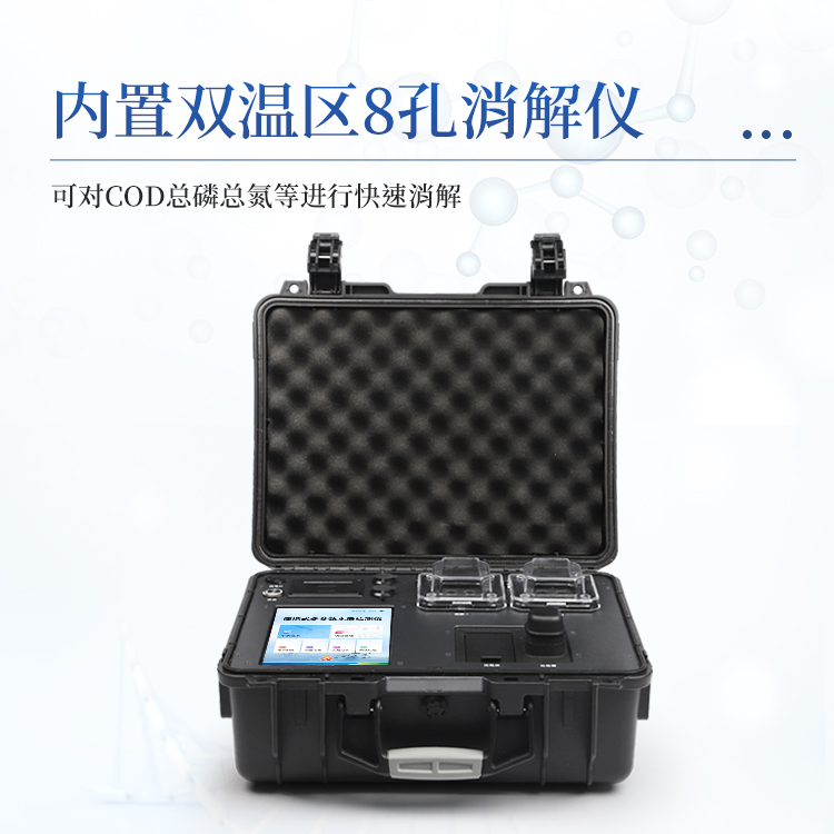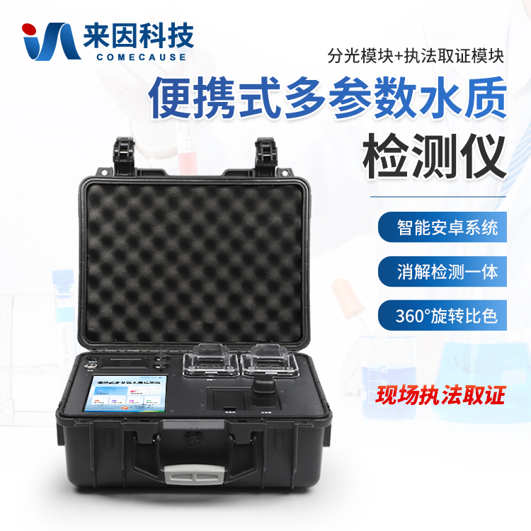 便携多参数水质检测仪采用高强度PVC工程塑料手提箱设计,消解检测一体式设计,其中消解模块具备双温区功能,检测部分同时具备360°旋转比色管检测和比色皿检测,安卓智能操作系统,8英寸高清液晶触摸屏,光纤检测技术,进口光源,内置大容量锂电池,现场执法取证模块,便携多参数水质检测仪具有性能稳定、测量准确、测定范围广、功能强大、操作简单等特点。