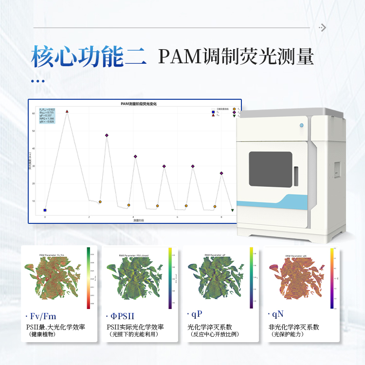 简要描述: 叶绿素荧光成像仪是一款专业的植物光合作用研究仪器,采用高灵敏度CMOS相机和LED光源控制,实现对植物叶片叶绿素荧光的快速、无损检测与成像分析。系统集成了OJIP快速荧光动力学测量和PAM调制荧光测量两大核心功能,能够全面评估植物光合系统的活性、光能利用效率以及环境胁迫响应。